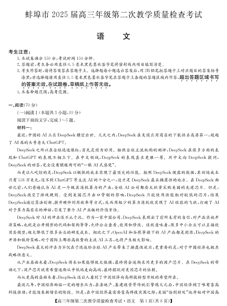 安徽省蚌埠市2025届高三第二次教学质量检查考试(蚌埠二模)语文+答案
