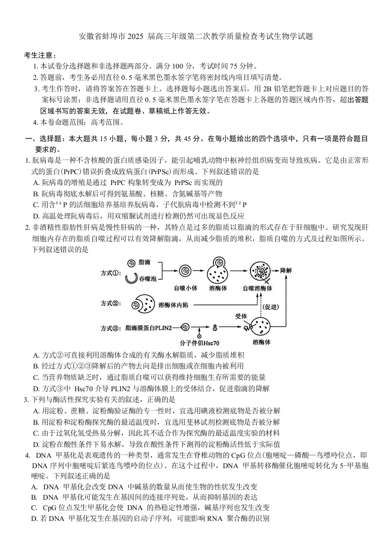 安徽省蚌埠市2025届高三第二次教学质量检查考试(蚌埠二模)生物+答案