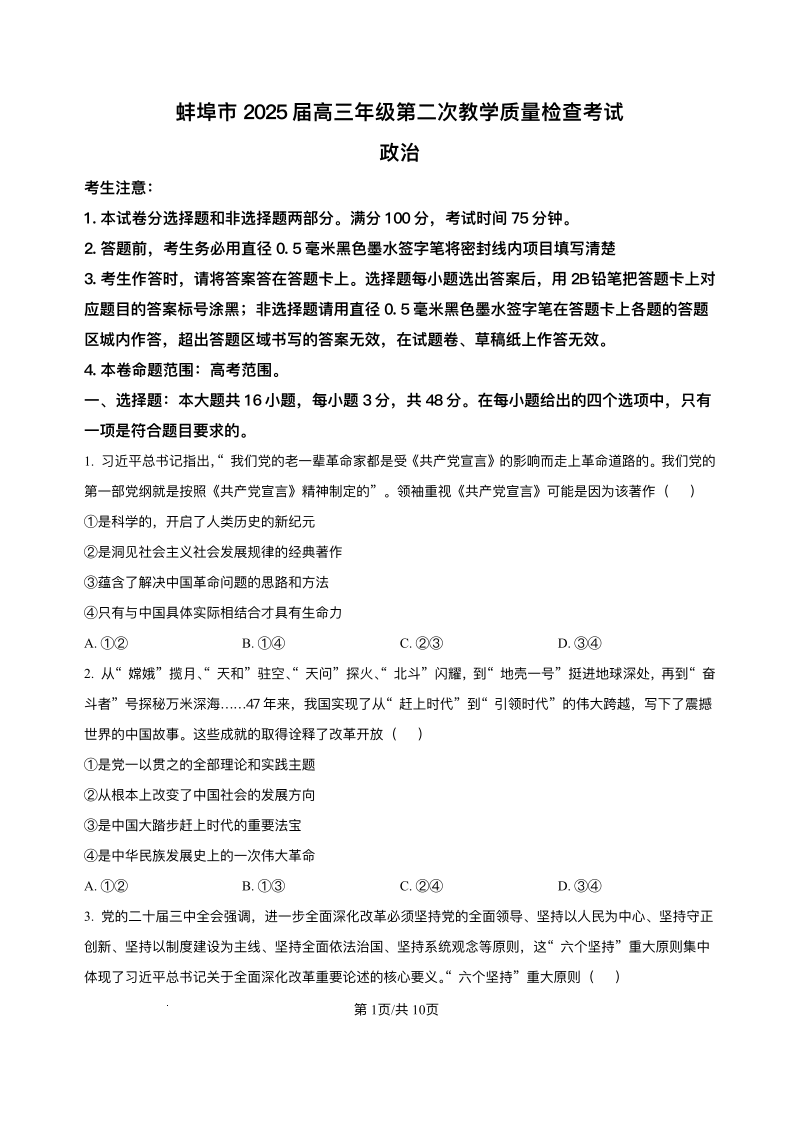 安徽省蚌埠市2025届高三第二次教学质量检查考试(蚌埠二模)政治+答案