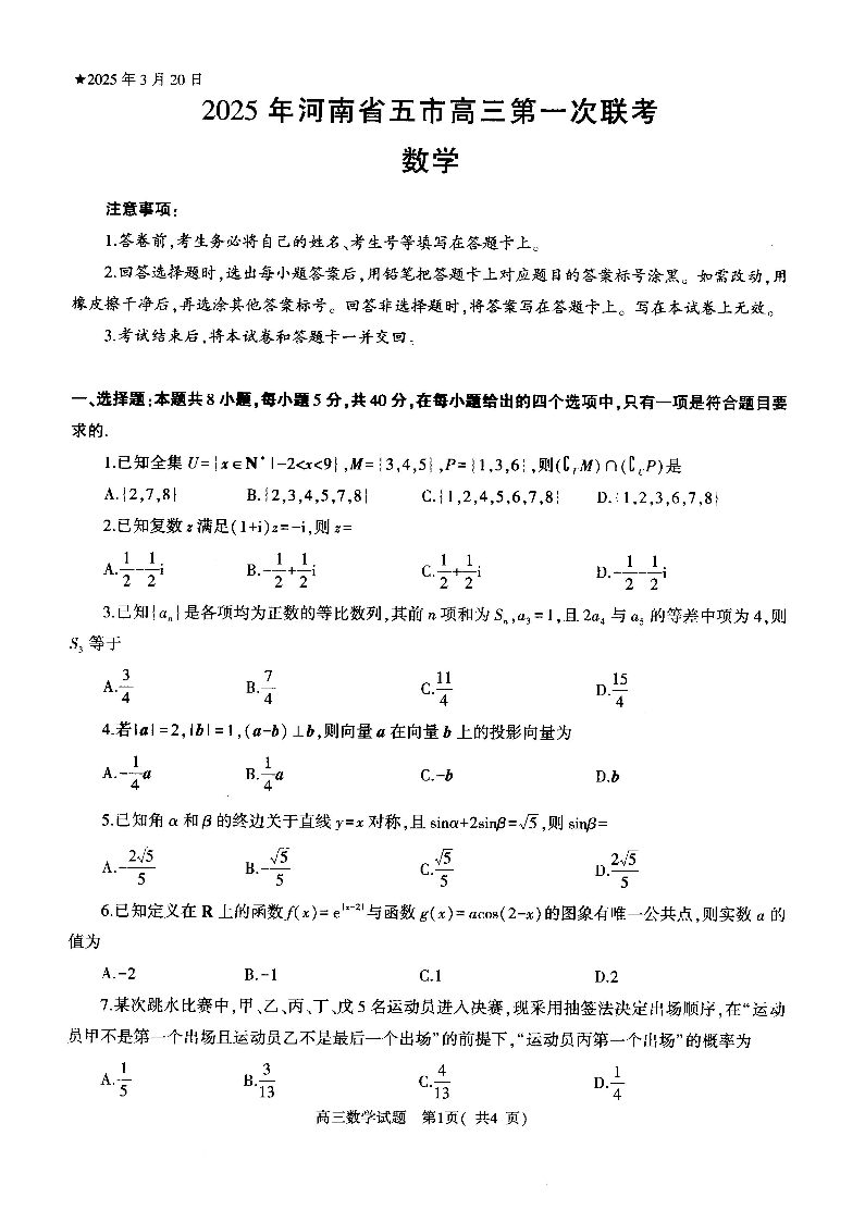 河南省(驻马店、漯河、南阳、信阳、三门峡)五市2025届高三第一次联考试题(五市一模)数学