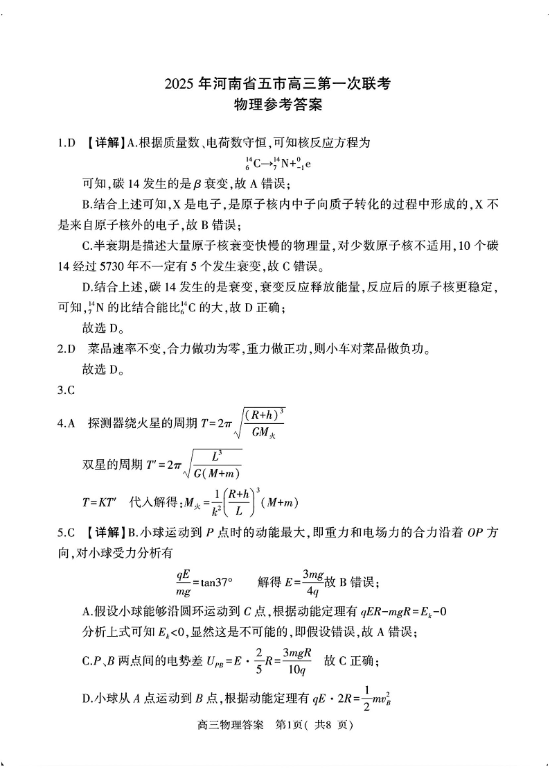 河南省(驻马店、漯河、南阳、信阳、三门峡)五市2025届高三第一次联考试题(五市一模)物理答案