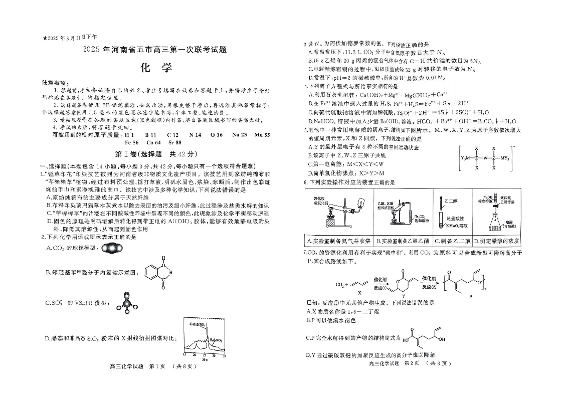 河南省(驻马店、漯河、南阳、信阳、三门峡)五市2025届高三第一次联考试题(五市一模)化学