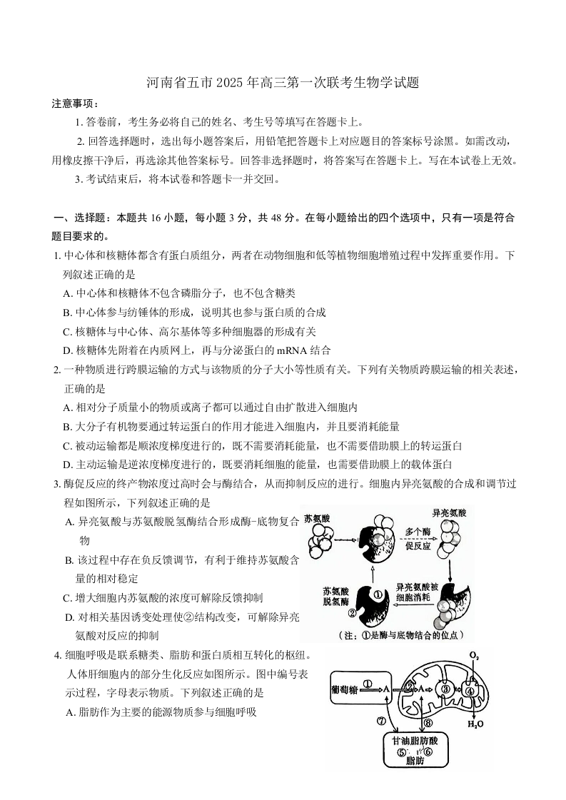 河南省(驻马店、漯河、南阳、信阳、三门峡)五市2025届高三第一次联考试题(五市一模)生物+答案