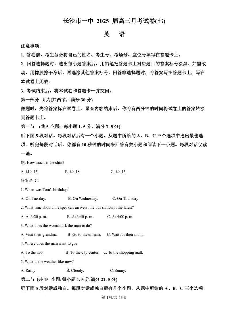 湖南省长沙市第一中学2024-2025学年高三下学期3月月考英语(原卷版)