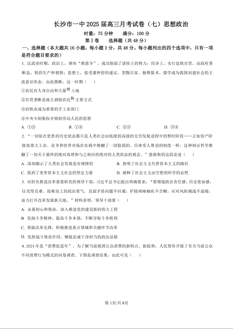 湖南省长沙市第一中学2024-2025学年高三下学期3月月考政治(原卷版)
