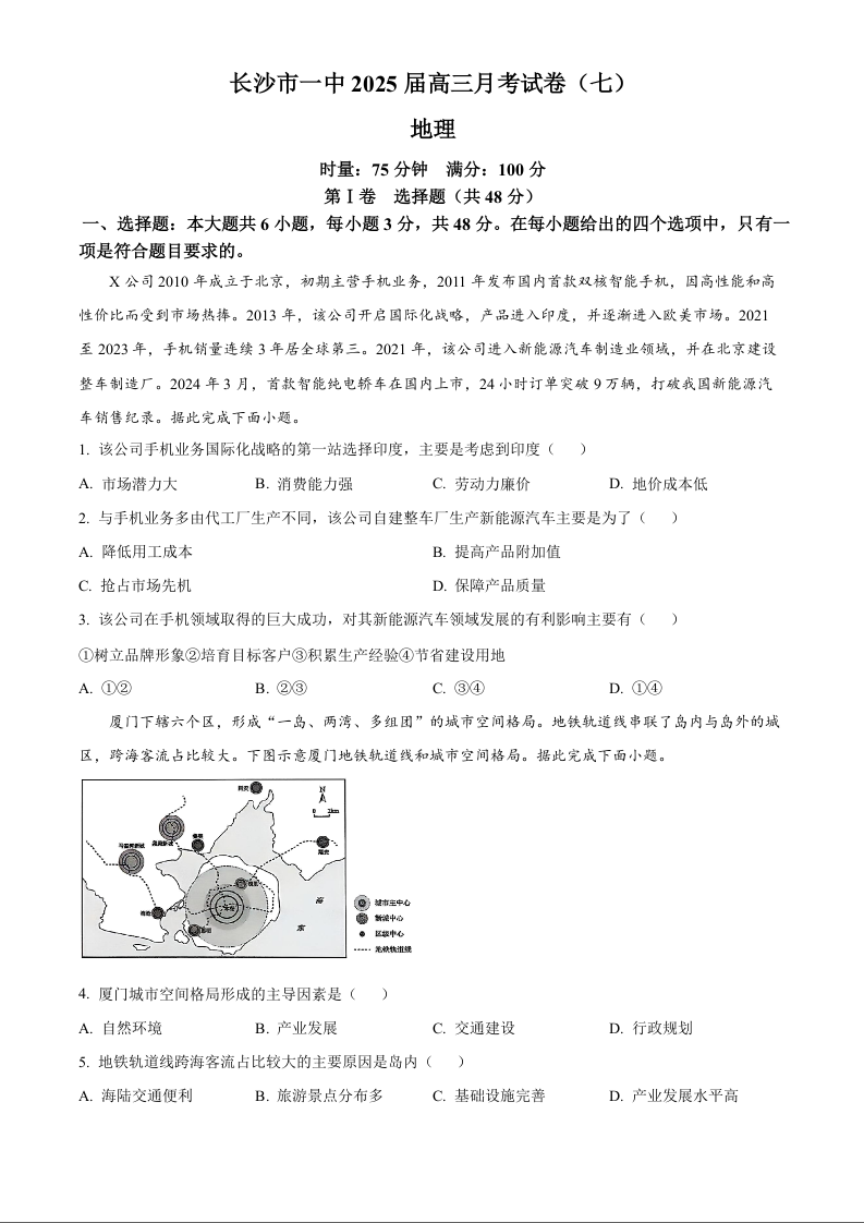 湖南省长沙市第一中学2024-2025学年高三下学期3月月考地理+答案
