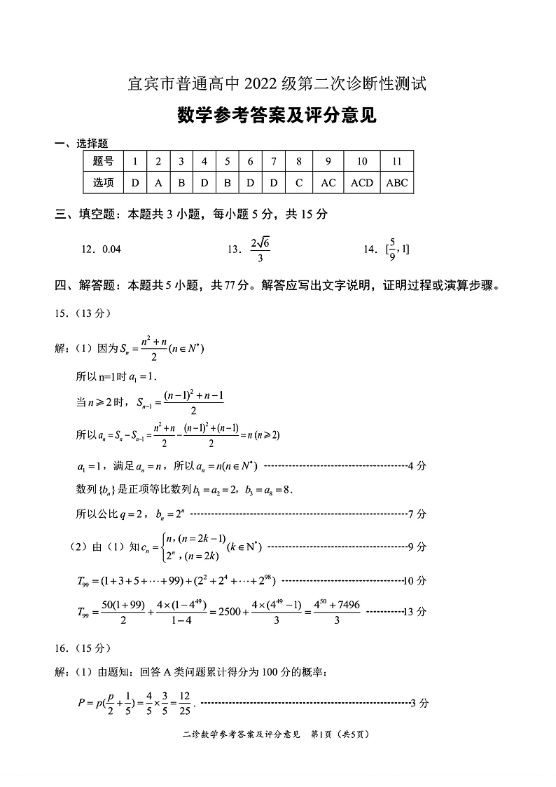 四川省乐山市,自贡市,宜宾市2025届高三第二次诊断性考试数学答案