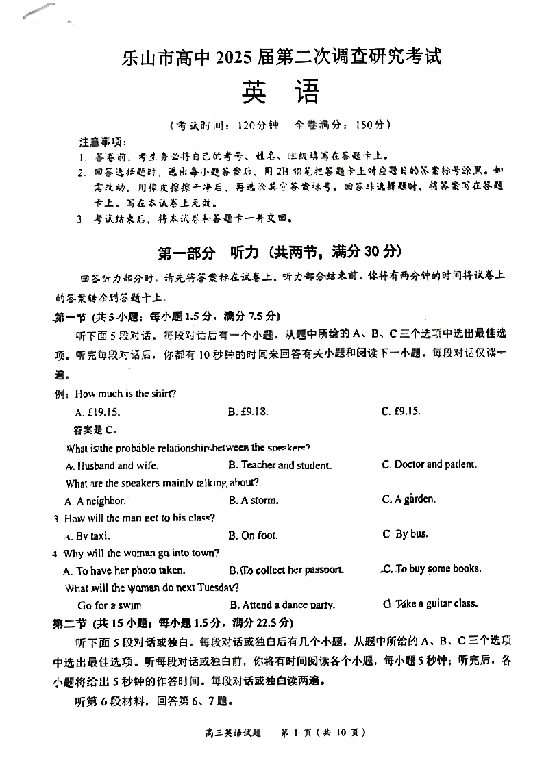 四川省乐山市,自贡市,宜宾市2025届高三第二次诊断性考试英语