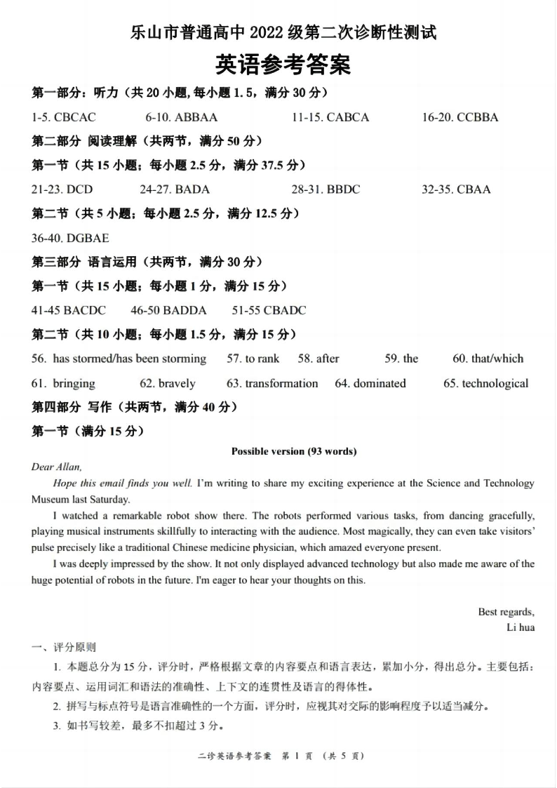 四川省乐山市,自贡市,宜宾市2025届高三第二次诊断性考试英语答案