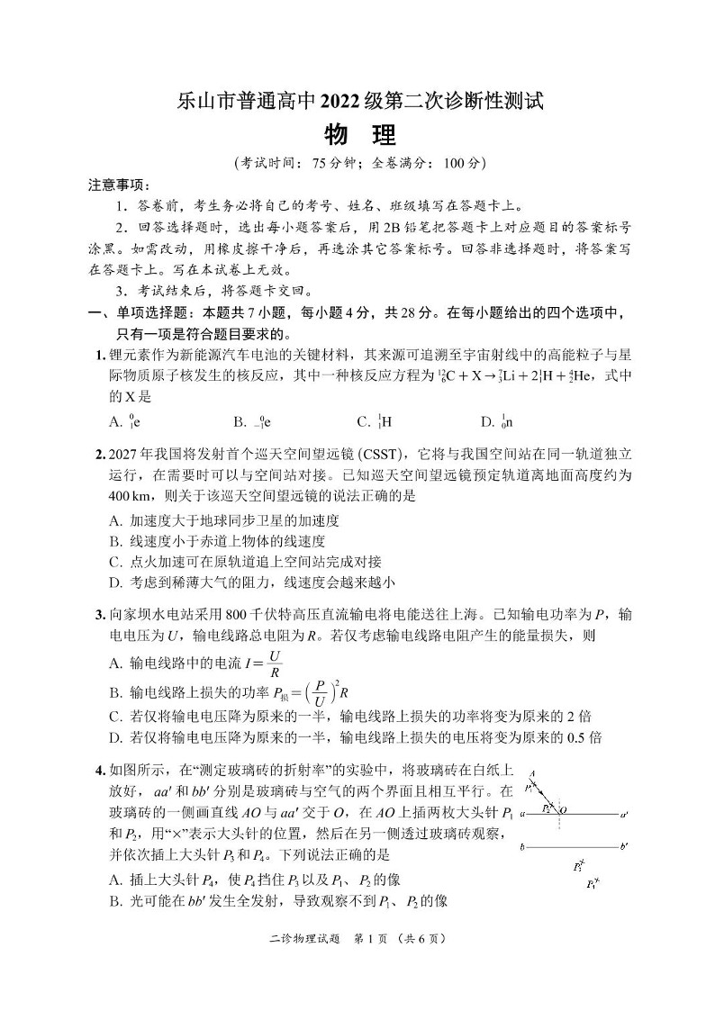 四川省乐山市,自贡市,宜宾市2025届高三第二次诊断性考试物理+答案