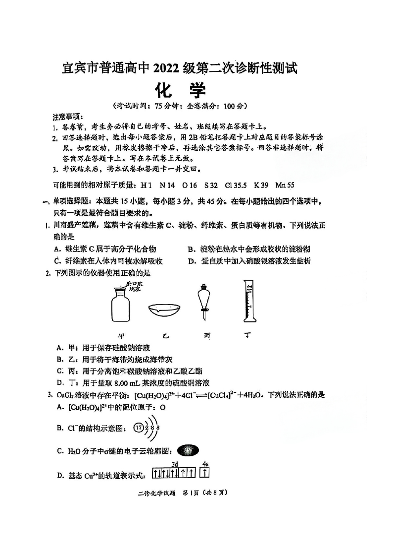 四川省乐山市,自贡市,宜宾市2025届高三第二次诊断性考试化学