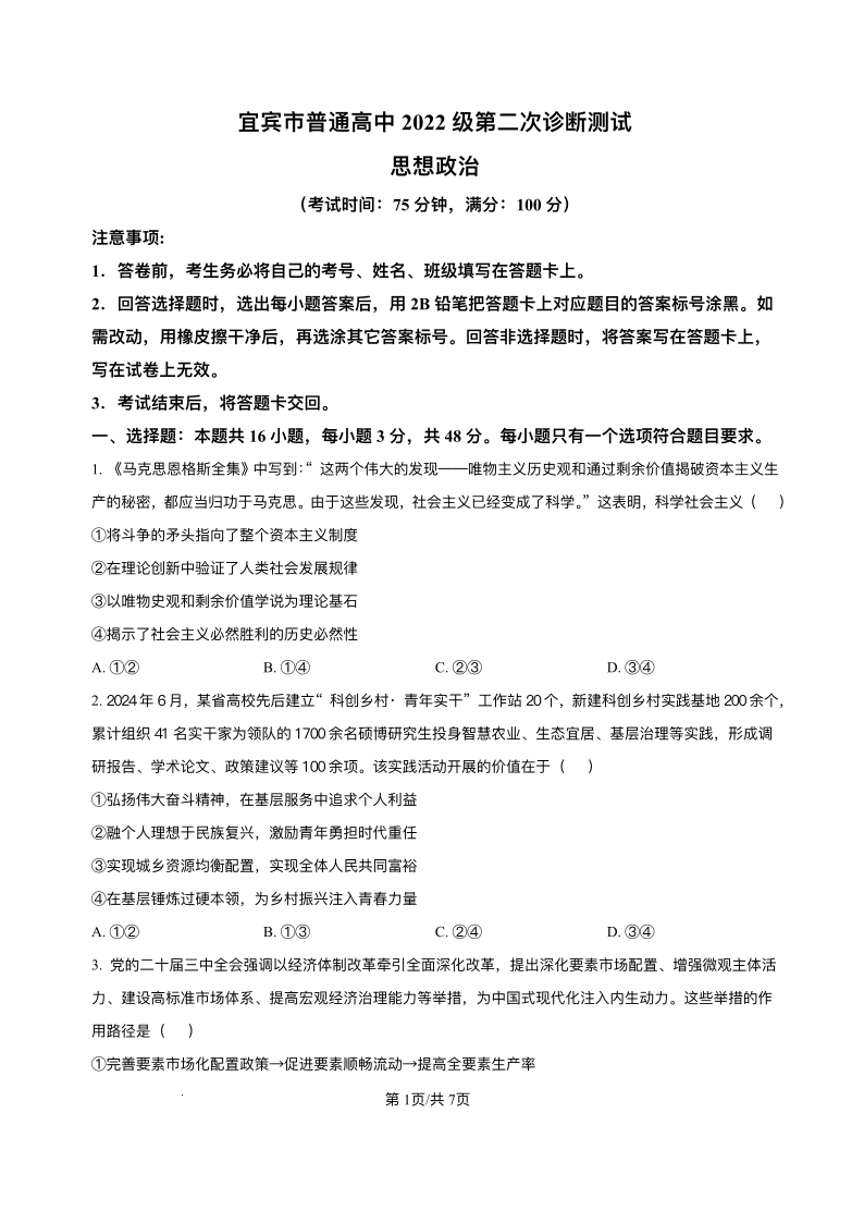 四川省乐山市,自贡市,宜宾市2025届高三第二次诊断性考试政治+答案