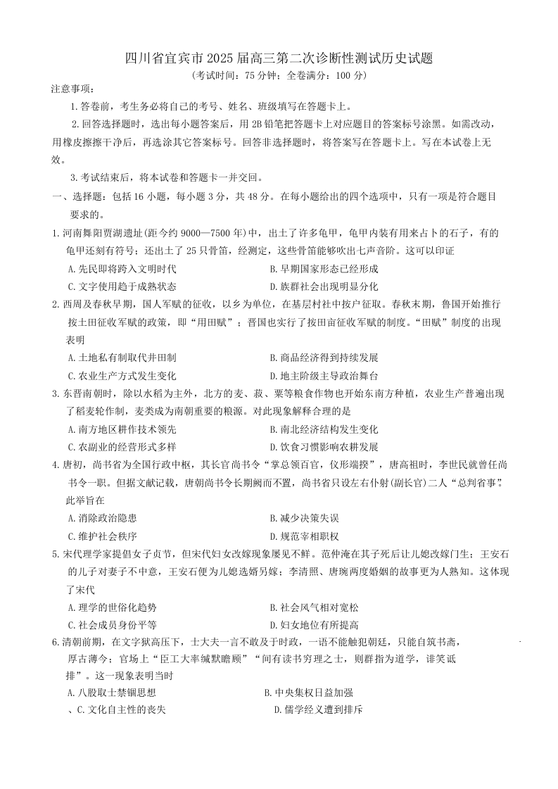 四川省乐山市,自贡市,宜宾市2025届高三第二次诊断性考试历史+答案