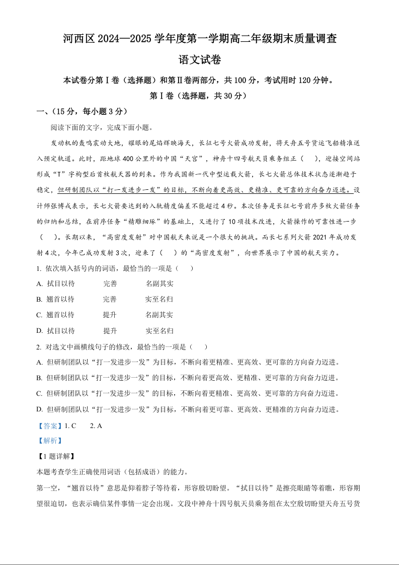 天津市河西区2024-2025学年上学期高二期末考试语文(解析版)
