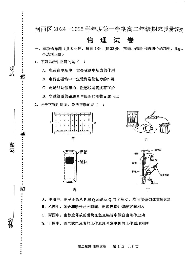 天津市河西区2024-2025学年上学期高二期末考试物理+答案