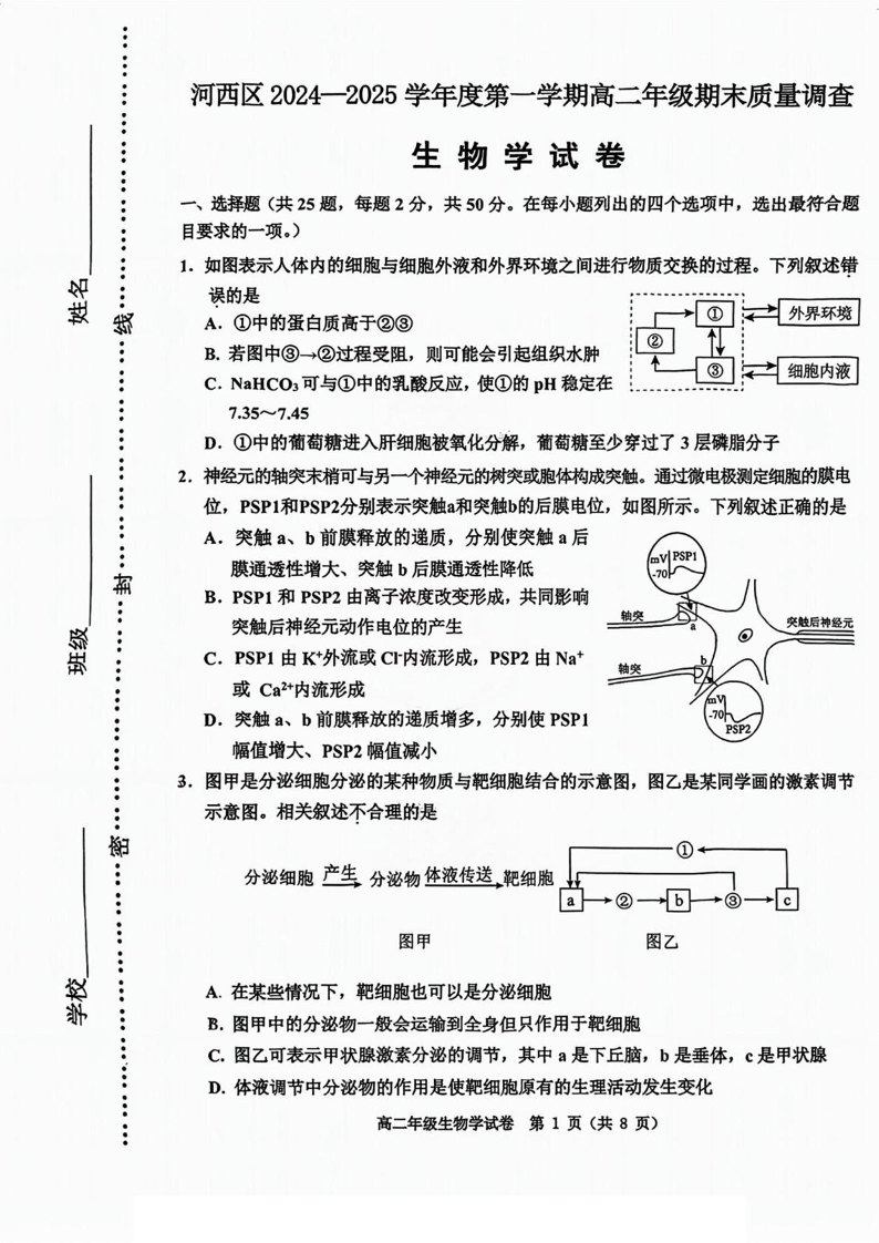 天津市河西区2024-2025学年上学期高二期末考试生物+答案