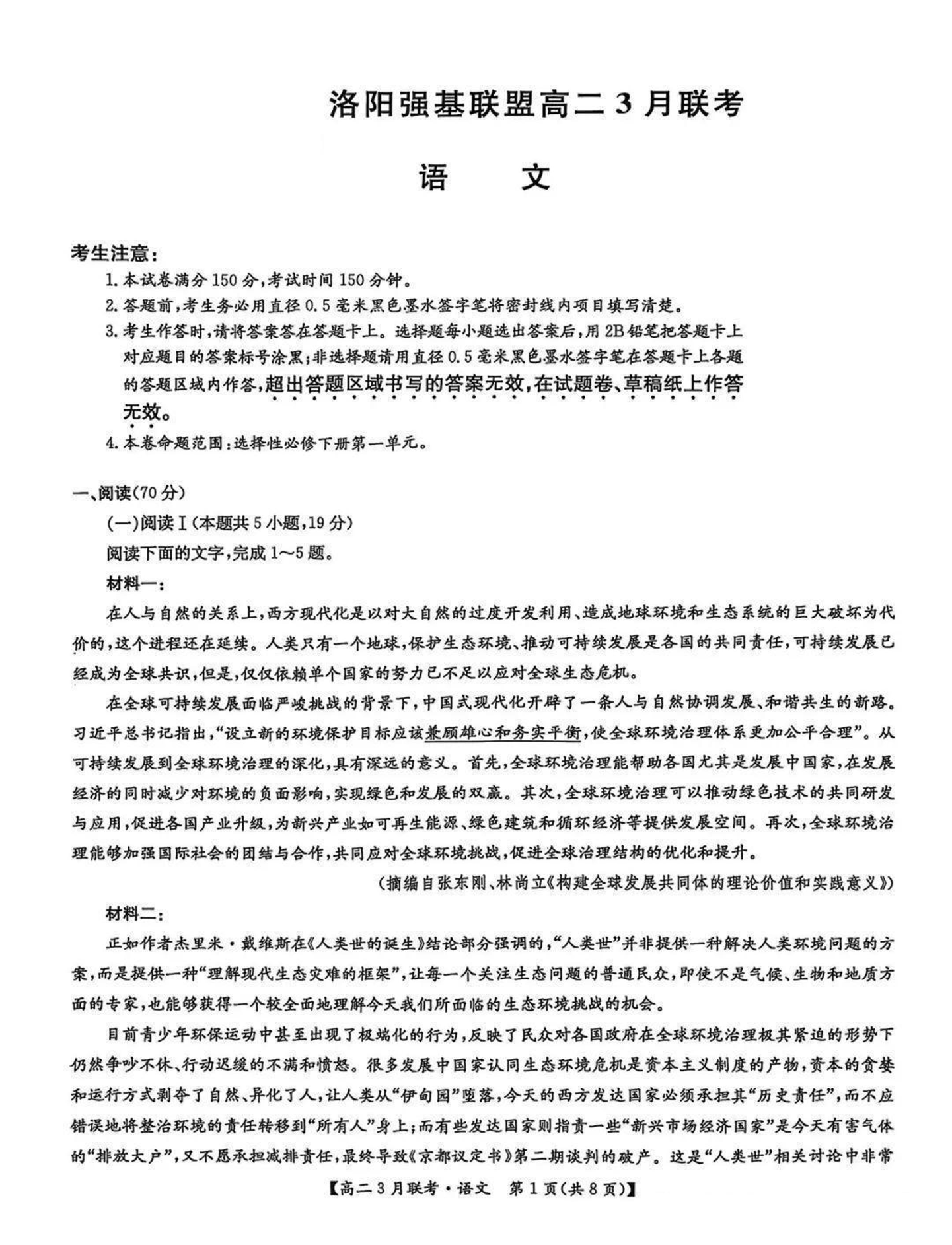 河南省洛阳市强基联盟2024-2025学年下学期3月高二月考语文+答案