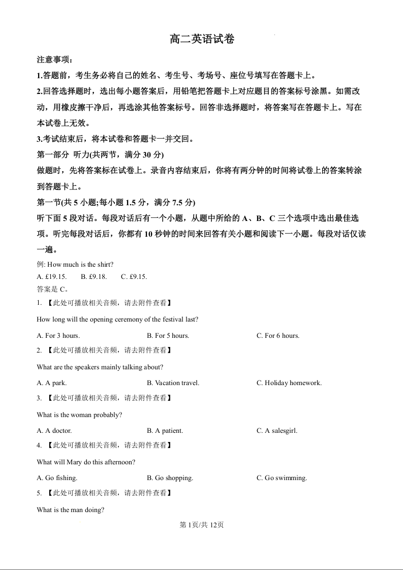 江西省部分学校2024-2025学年下学期3月高二联考英语(原卷版)