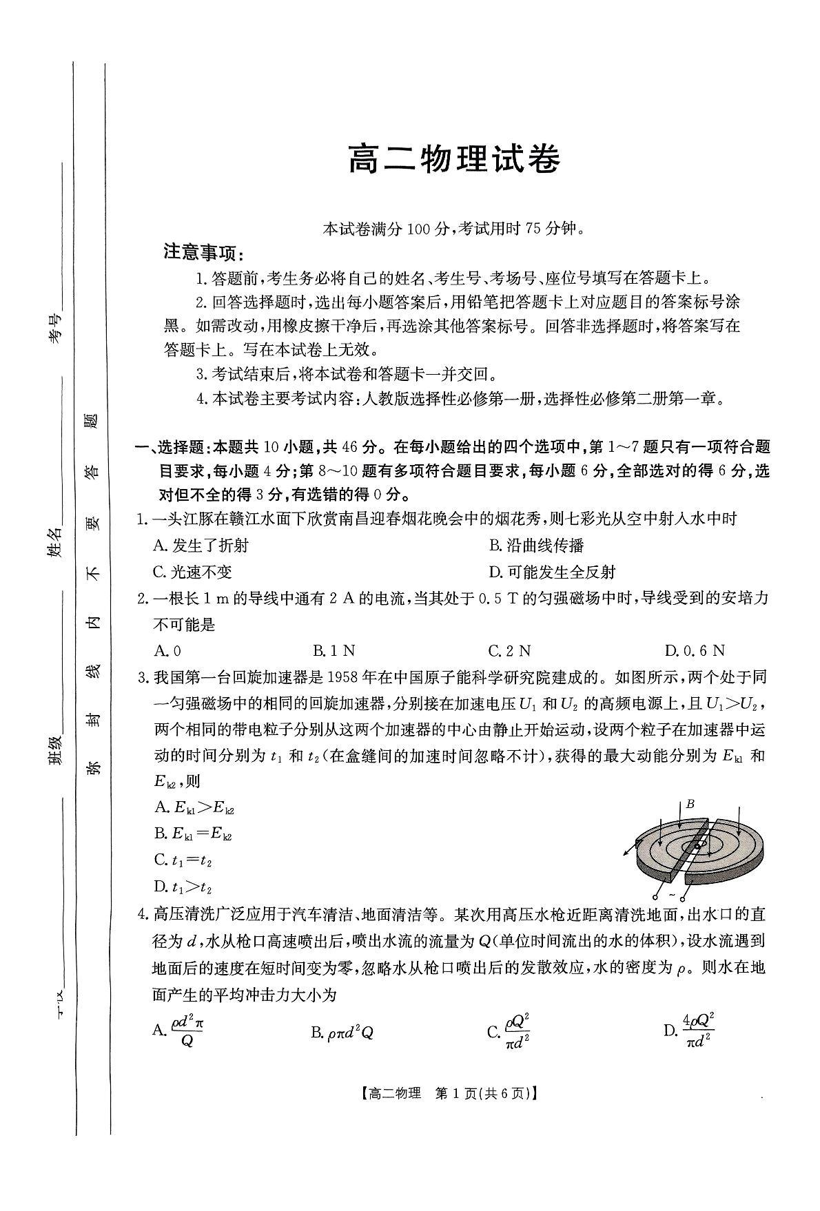 江西省部分学校2024-2025学年下学期3月高二联考物理