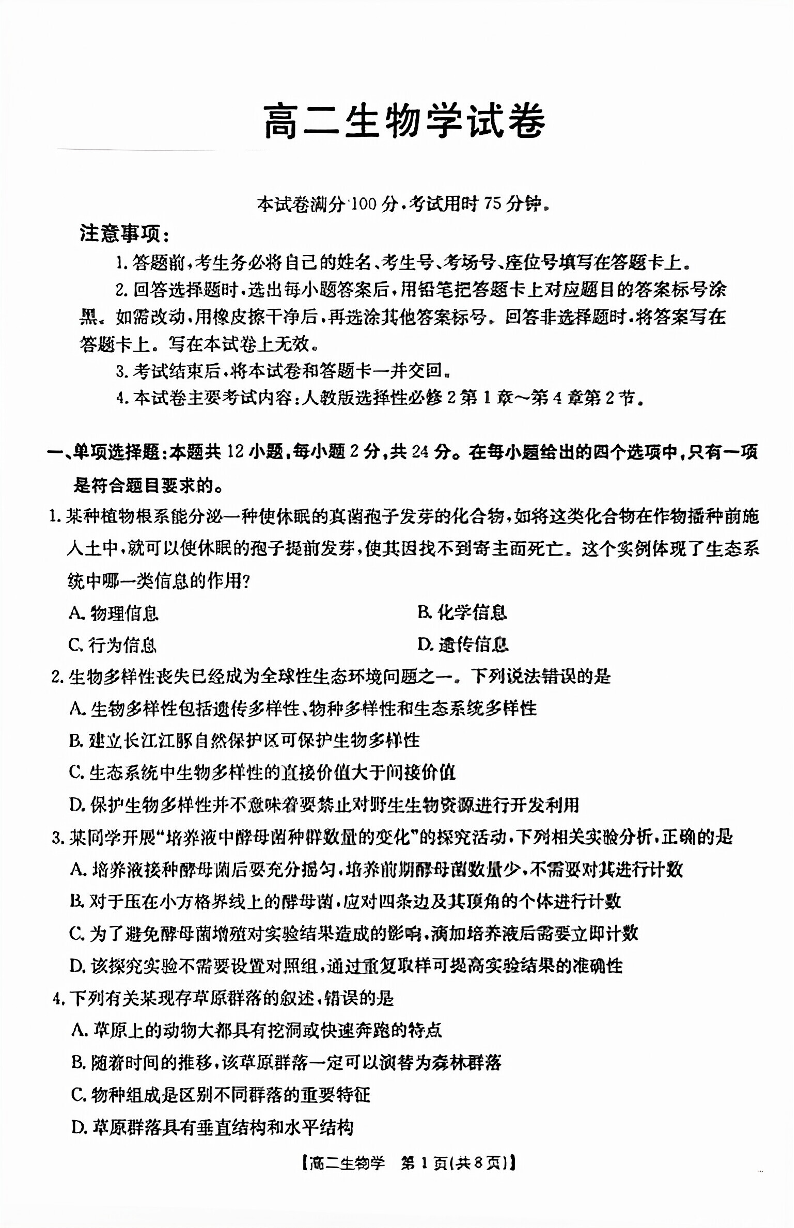江西省部分学校2024-2025学年下学期3月高二联考生物