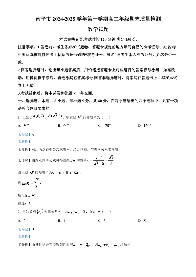 福建省南平市2024-2025学年上学期1月高一期末考试数学(解析版)