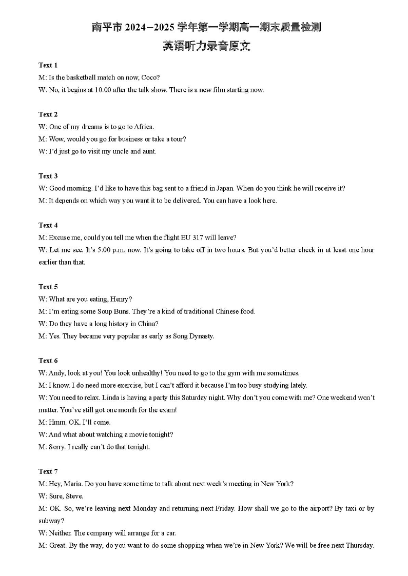 福建省南平市2024-2025学年上学期1月高一期末考试英语听力录音原文