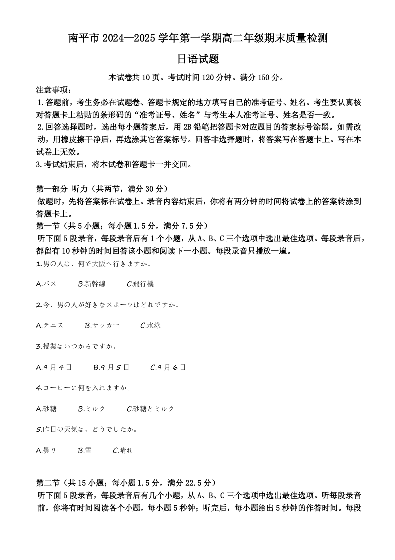 福建省南平市2024-2025学年上学期1月高一期末考试日语(解析版)
