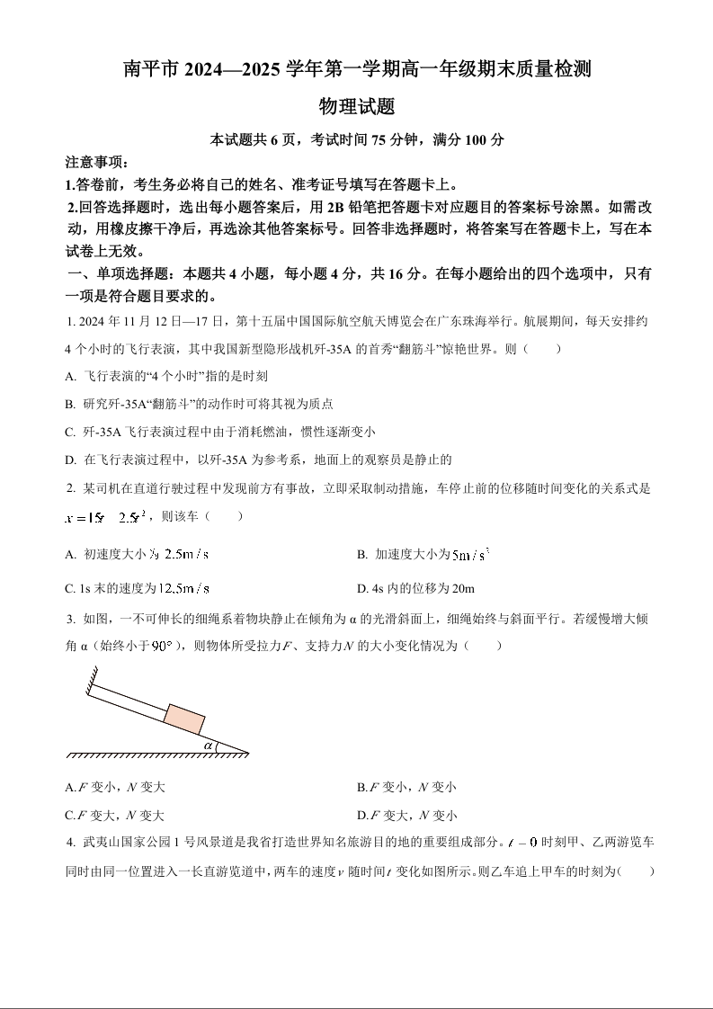 福建省南平市2024-2025学年上学期1月高一期末考试物理(原卷版)