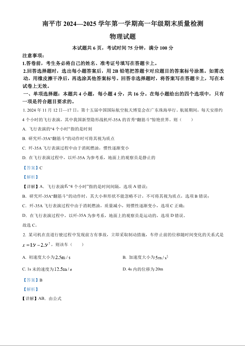 福建省南平市2024-2025学年上学期1月高一期末考试物理(解析版)