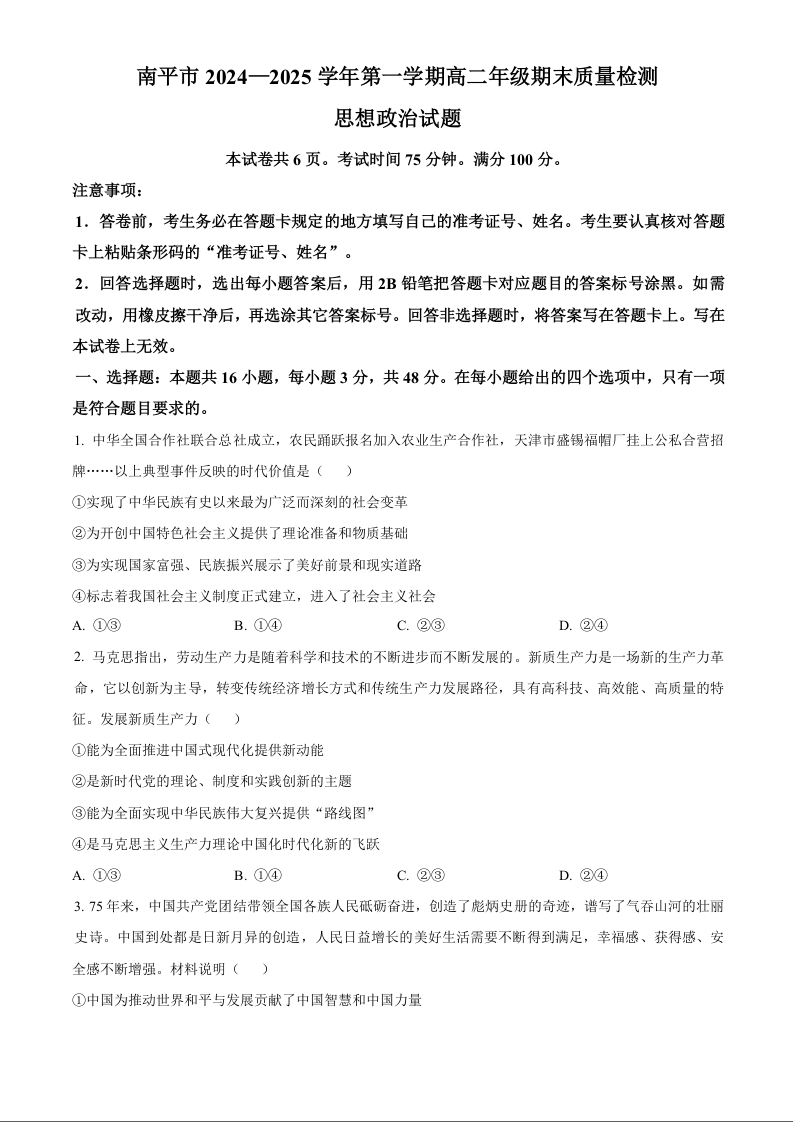 福建省南平市2024-2025学年上学期1月高一期末考试政治(原卷版)