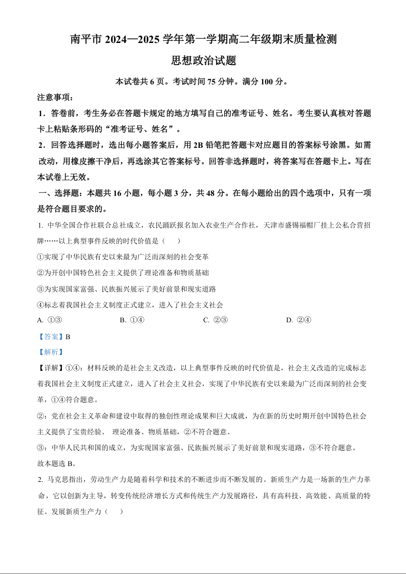 福建省南平市2024-2025学年上学期1月高一期末考试政治(解析版)