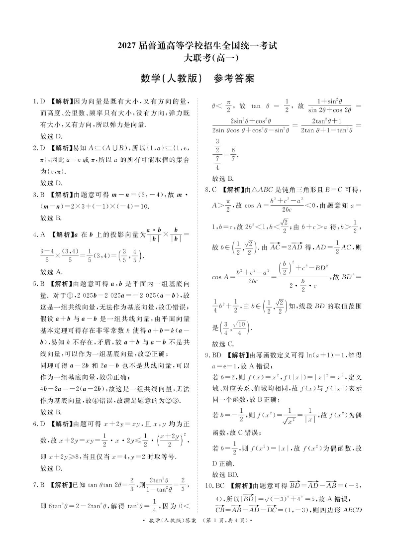 河南省部分名校2024-2025学年下学期3月高一联考数学答案