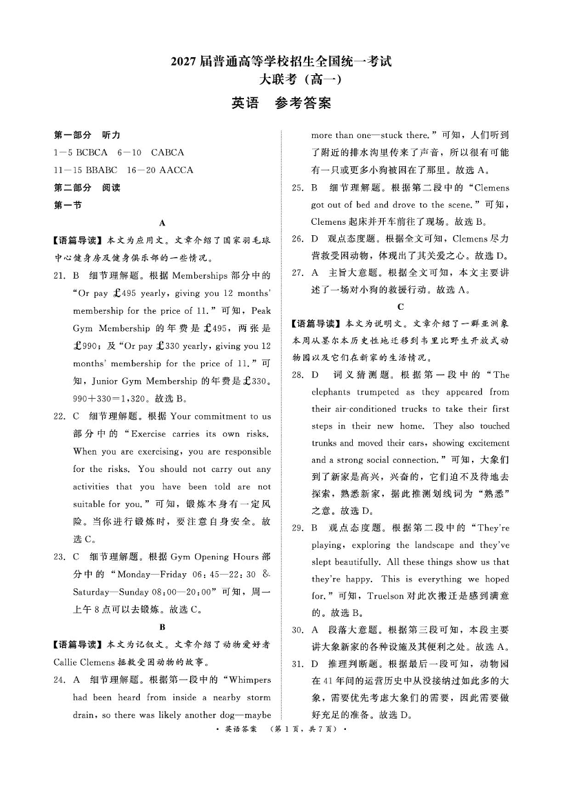 河南省部分名校2024-2025学年下学期3月高一联考英语答案