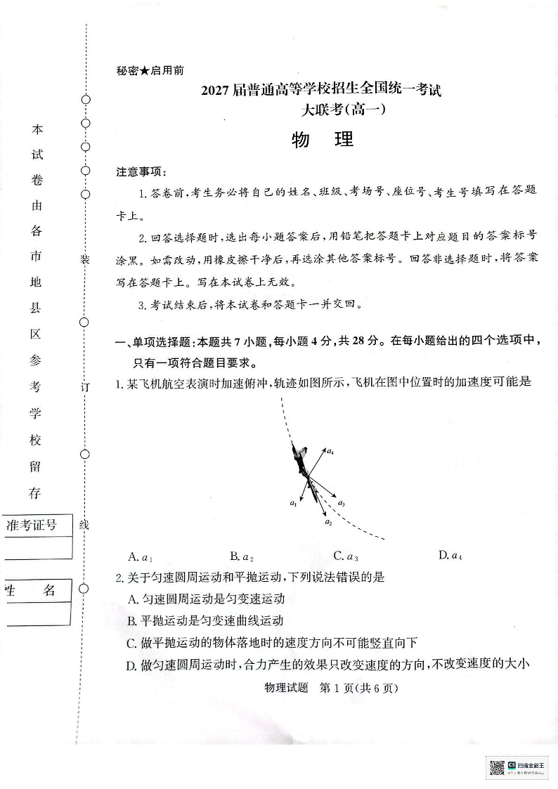 河南省部分名校2024-2025学年下学期3月高一联考物理
