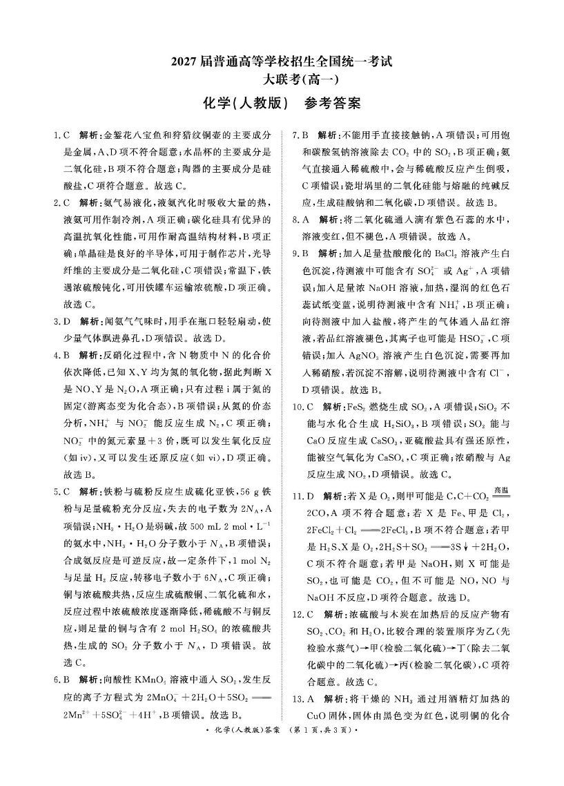 河南省部分名校2024-2025学年下学期3月高一联考化学答案
