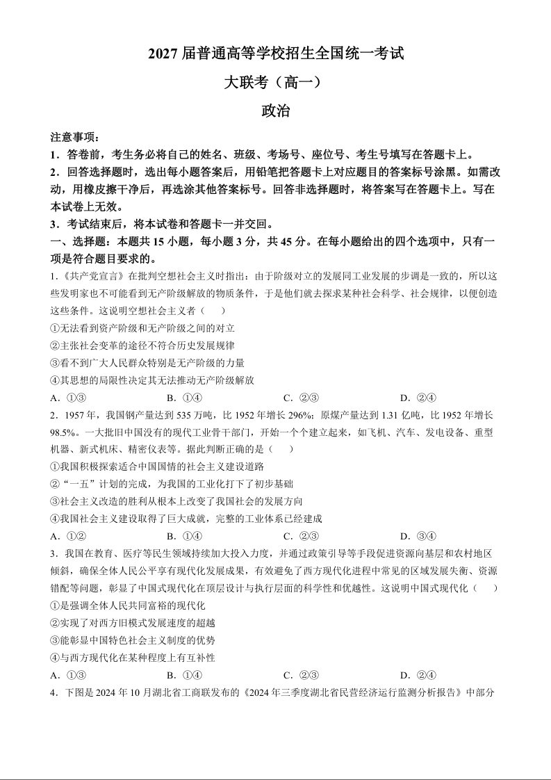 河南省部分名校2024-2025学年下学期3月高一联考政治+答案