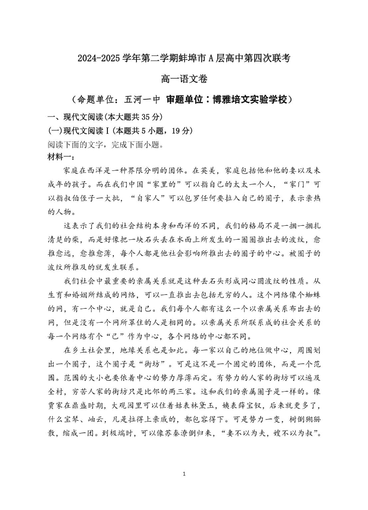 安徽省蚌埠市A层高中2024-2025学年下学期高一第四次联考语文+答案
