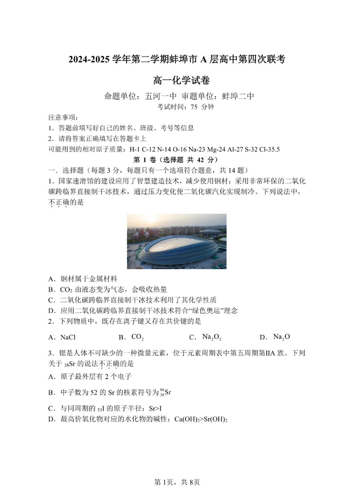 安徽省蚌埠市A层高中2024-2025学年下学期高一第四次联考化学+答案