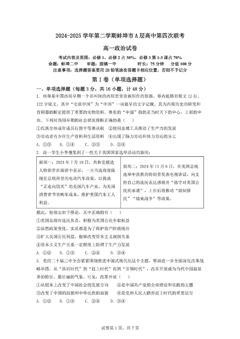 安徽省蚌埠市A层高中2024-2025学年下学期高一第四次联考政治+答案