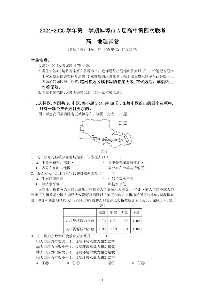 安徽省蚌埠市A层高中2024-2025学年下学期高一第四次联考地理+答案