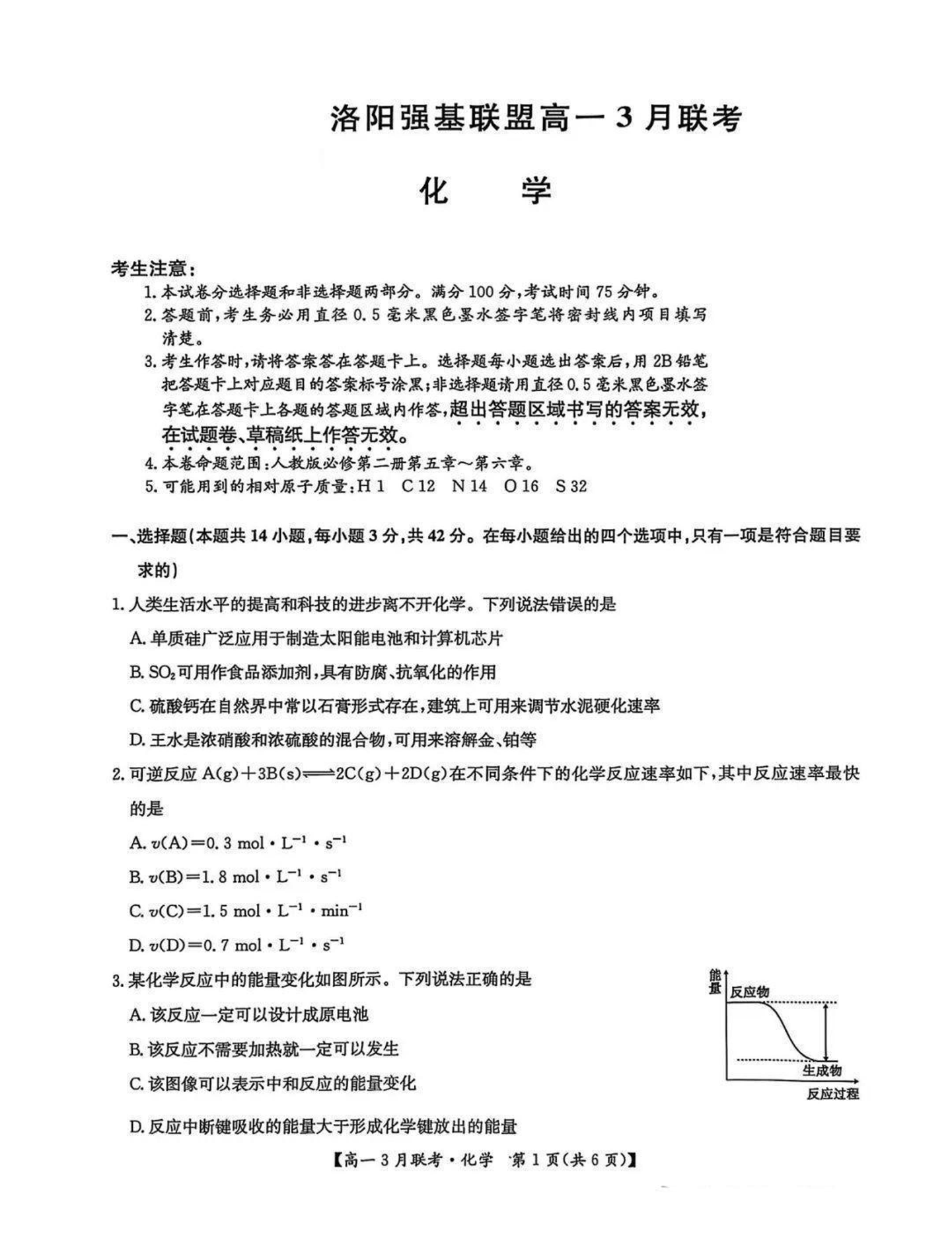 河南省洛阳市强基联盟2024-2025学年下学期3月高一月考化学+答案