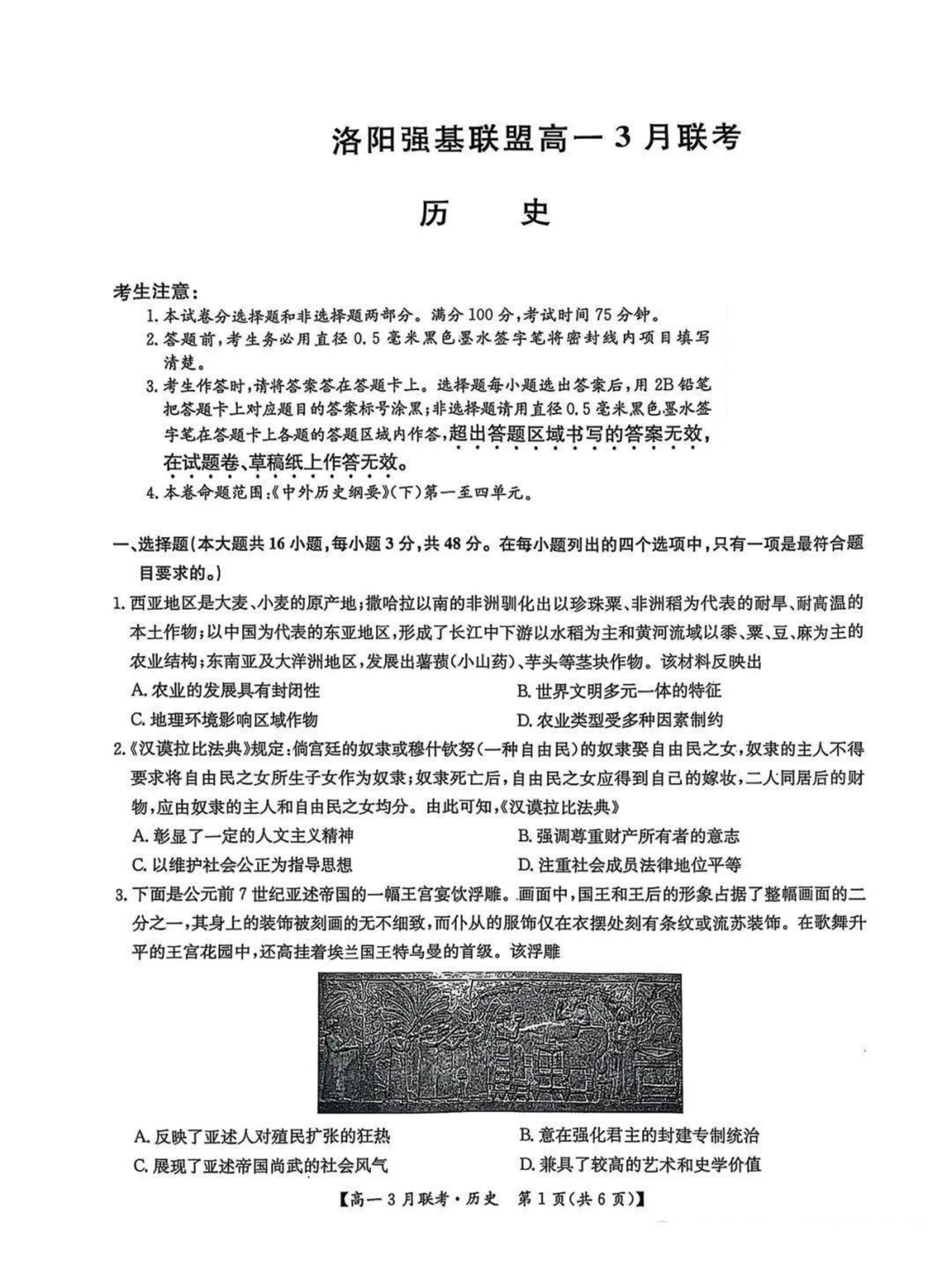 河南省洛阳市强基联盟2024-2025学年下学期3月高一月考历史+答案