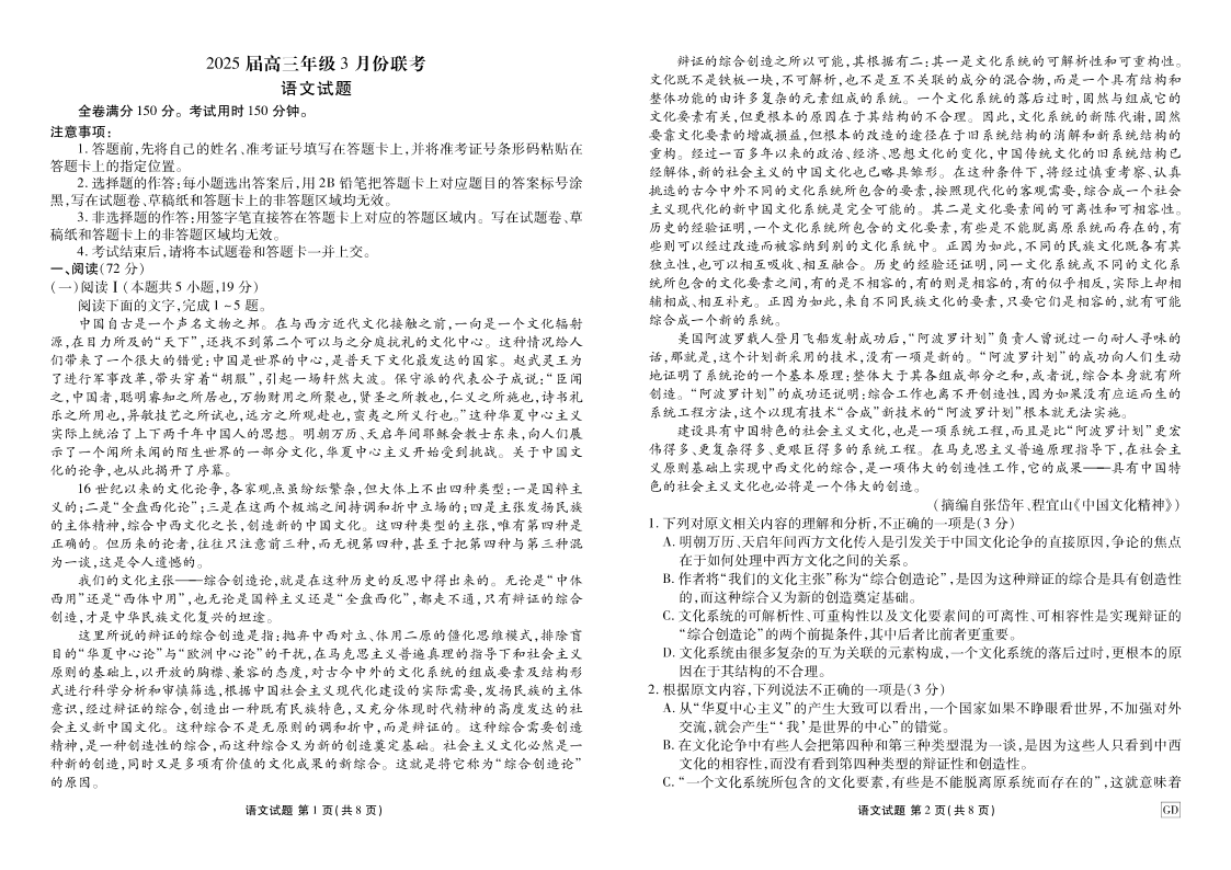 广东省衡水金卷2024-2025学年下学期3月高三大联考语文