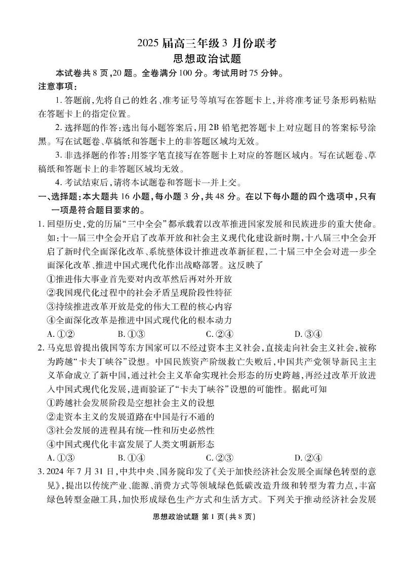 广东省衡水金卷2025届高三3月大联考政治
