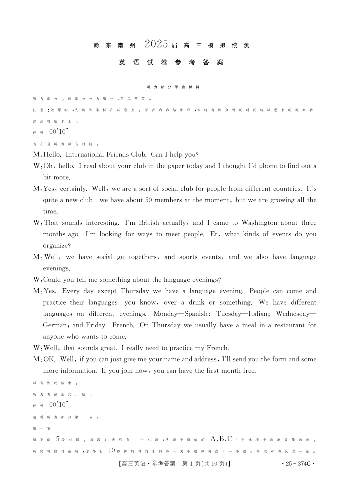 贵州省黔东南州2024-2025学年下学期3月高三模拟统测英语答案