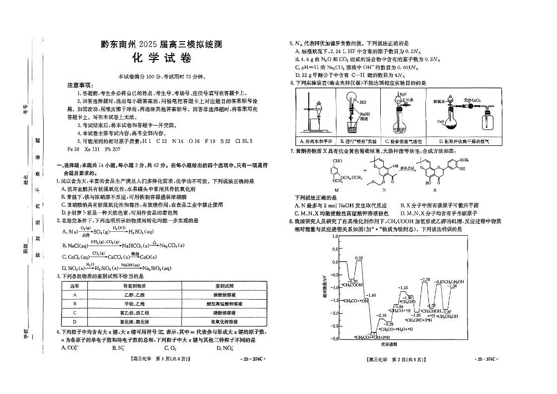 贵州省黔东南州2024-2025学年下学期3月高三模拟统测化学