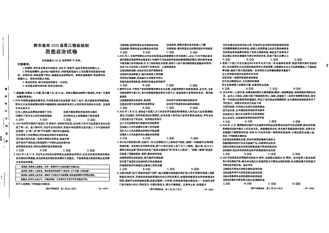贵州省黔东南州2024-2025学年下学期3月高三模拟统测政治