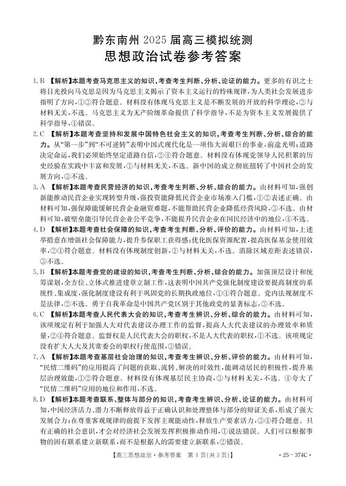 贵州省黔东南州2024-2025学年下学期3月高三模拟统测政治答案