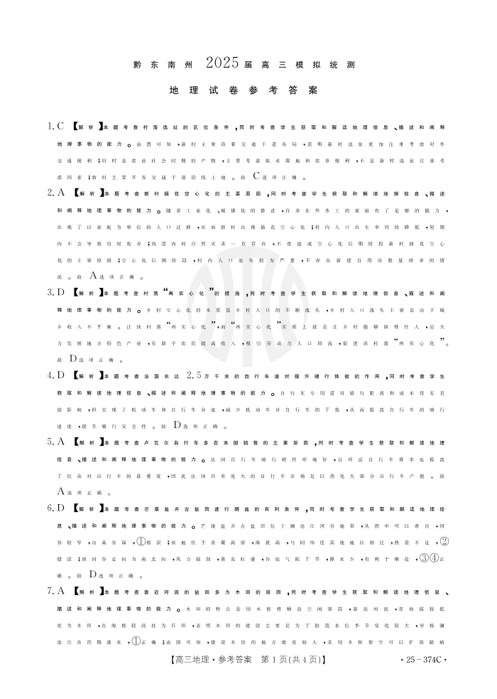 贵州省黔东南州2024-2025学年下学期3月高三模拟统测地理答案