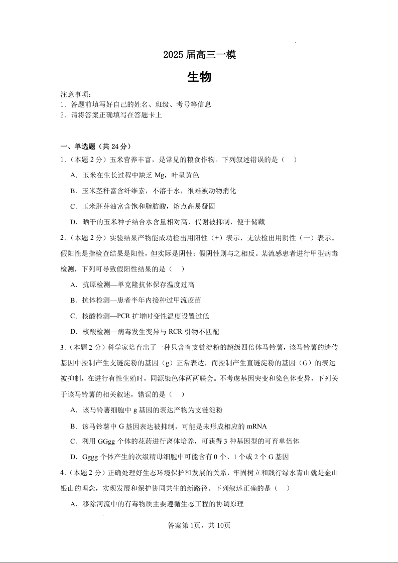 湖南省长沙市望城区一中2024-2025学年下学期3月高三一模生物
